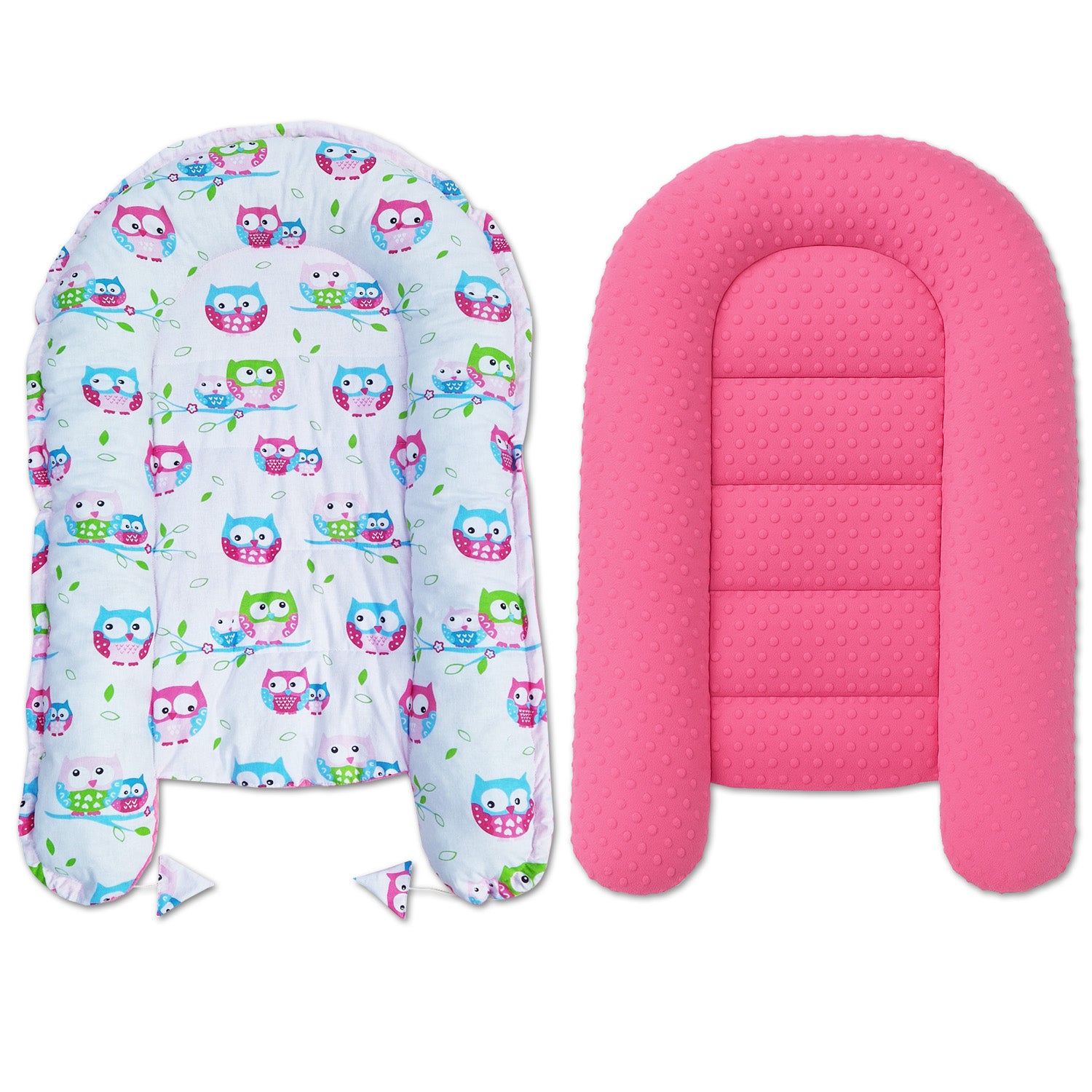 Babynest Kokon aus Baumwolle & Minky - Rosa Minky / Bunte Eulen
