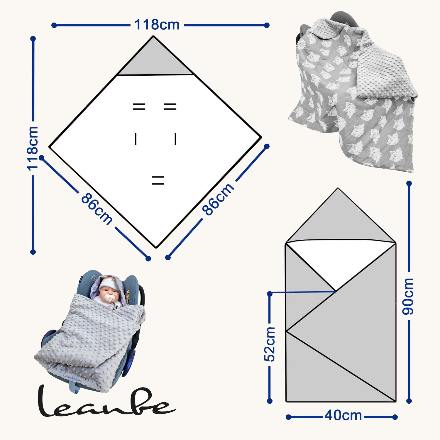 Die Einschlagdecke von Leanbe hat eine praktische Größe von 86 × 86 cm und passt in die meisten Babyschalen, Kinderwagen und Autositze. Sie verfügt über eine große Kapuze und einen Druckknopfverschluss, die das Baby sicher und warm umhüllen.