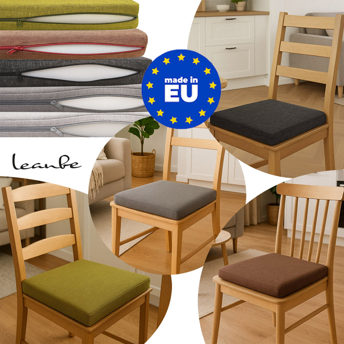 Das Leanbe Sitzkissen 2er Set besteht aus zwei identischen Kissen mit den Maßen 40 × 40 × 5 cm. Jedes Kissen verfügt über einen robusten Bezug mit Reißverschluss, der sich leicht abnehmen und reinigen lässt. Die Polsterung sorgt für angenehmen Sitzkomfort und eignet sich ideal für Holzstühle, Küchenstühle, Balkonmöbel oder Gartenstühle.